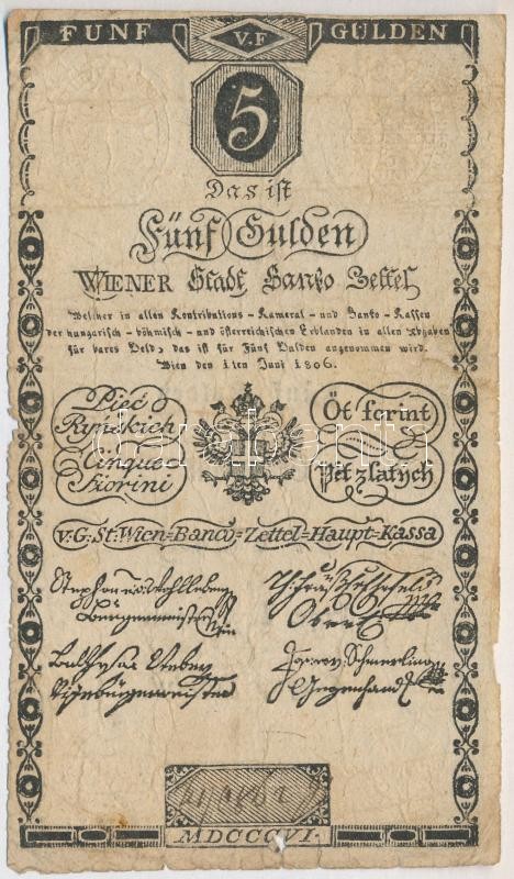 Leírás: 1806. 5G "Bécsi városi bankócédula" T: III- Habsburg Monarchy 1806. 5 Gulden "Wiener-Stadt Banco-Zettel" C:VG