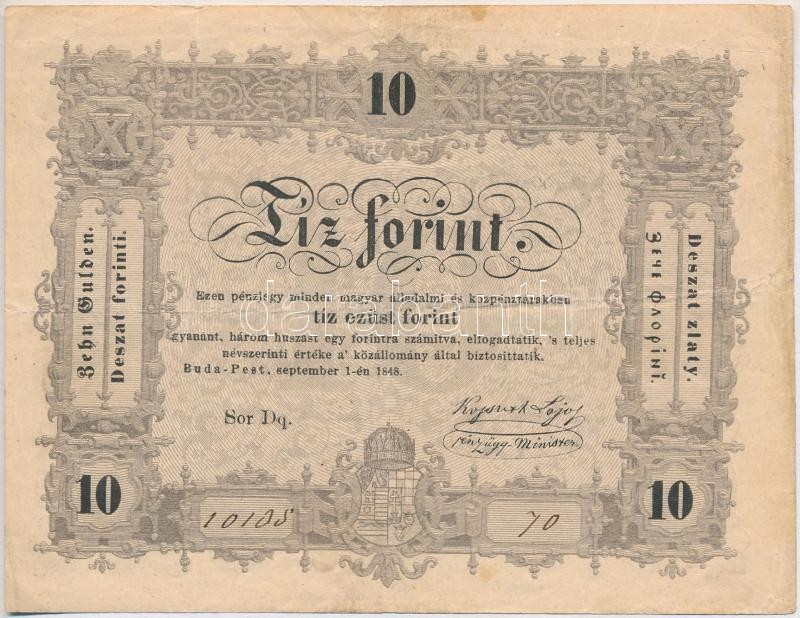 1848. 10Ft "Kossuth Bankó" hátlapi szövegben "BÜNTETETT... https://www.darabanth.com/hu/336-Gyorsarveres/336.0/Numizmatika/Magyar-bankjegyek~1500007/1848-10Ft-Kossuth-Banko-hatlapi-szovegben-BUNTETETTNEK-sajtohiba-TIII-III--Adamo-G111~II1886910