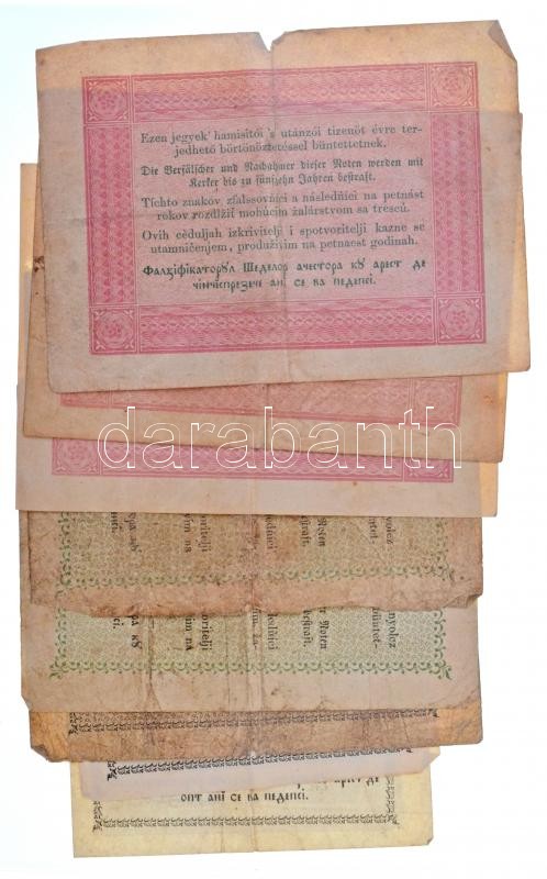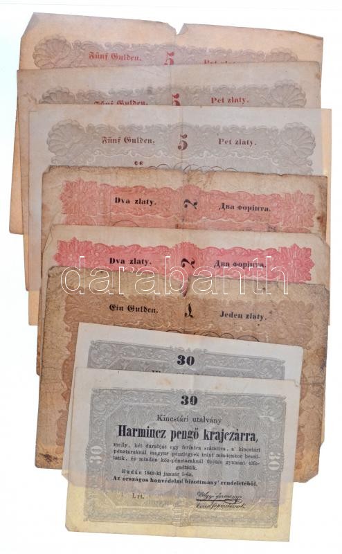 Leírás: 1848. 1Ft "Kossuth bankó" + 2Ft "Kossuth bankó" (2x) + 5Ft "Kossuth bankó" vörösesbarna nyomat (2x) + 5Ft "Kossuth bankó" barna nyomat + 1849. 30kr "Kossuth bankó" (2x) T:III,III- szép papír, fo., anyaghiány