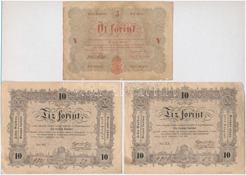 Leírás: 1848. 5Ft vörösesbarna + 10Ft (2x) "Kossuth-bankó" T:III szakadás