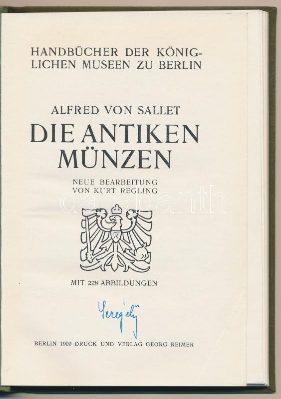 Alfred von Sallet: Die Antiken Münzen - Neue bearbeitung von Kurt Regling. Druck und Verlag Georg Reimer, Berlin 1909. Újszerű állapotban, Seregély Dezső szignójával.