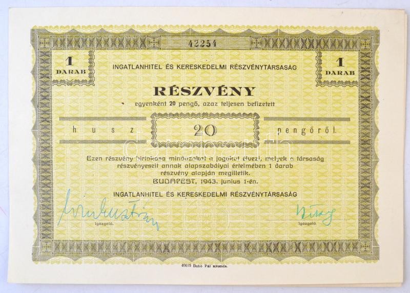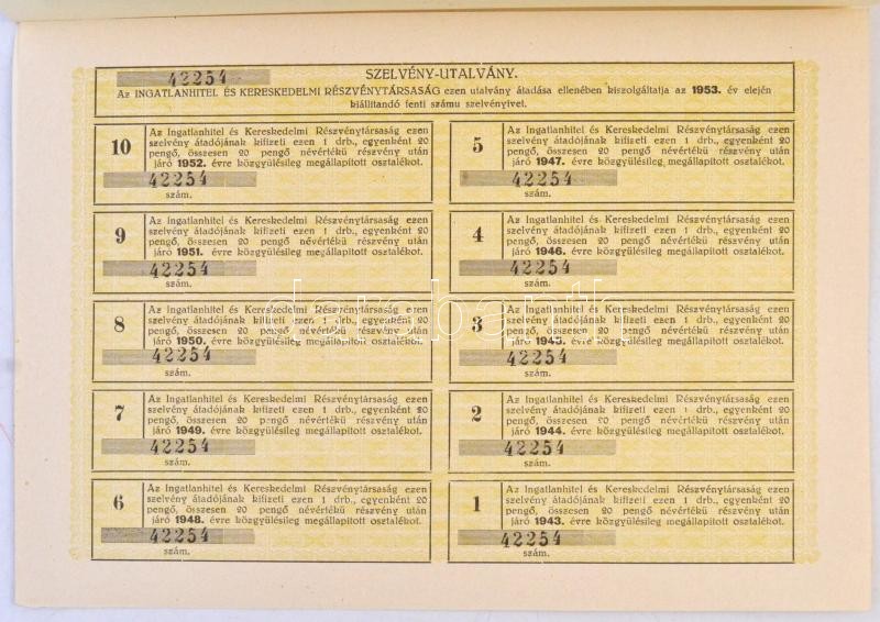 Leírás: Budapest 1943. "Ingatlanhitel és Kereskedelmi Részvénytársaság" részvénye 20P-ről, szárazpecséttel, szelvényekkel T:II