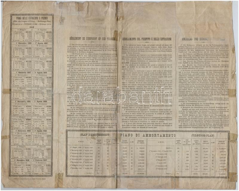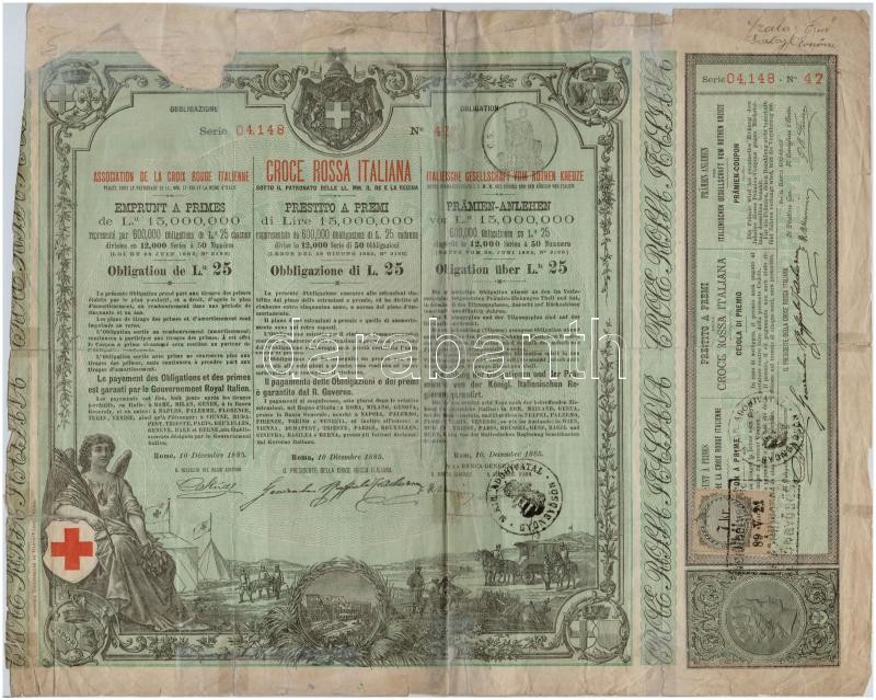 Olaszország / Róma 1885. "Olasz Vörös Kereszt" kötelezvény 25L-ról, három nyelven, bélyegzésekkel T:III-,IV
