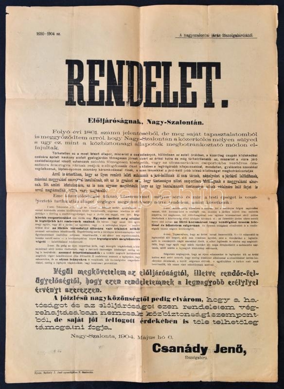 1904 Nagyszalontai főszolgabíró a közerkölcs helyreállításra vonatkozó rendelete. Nagyszalonta, Székely J. Jenő, a hátoldalon javítással, a széleken szakadással. 57x41 cm