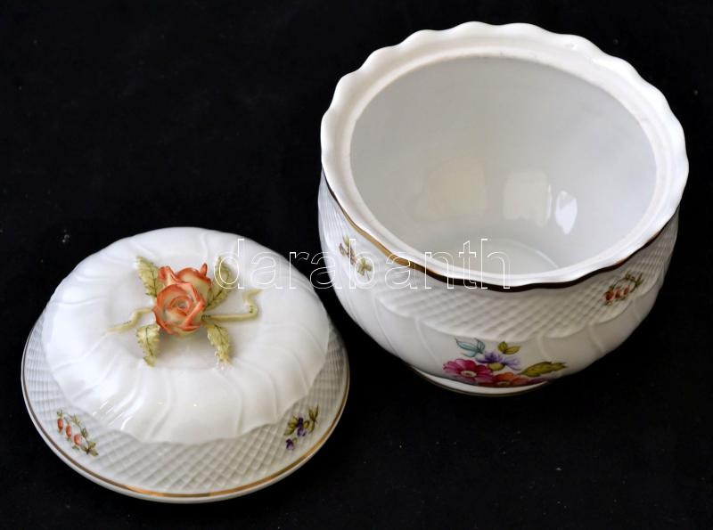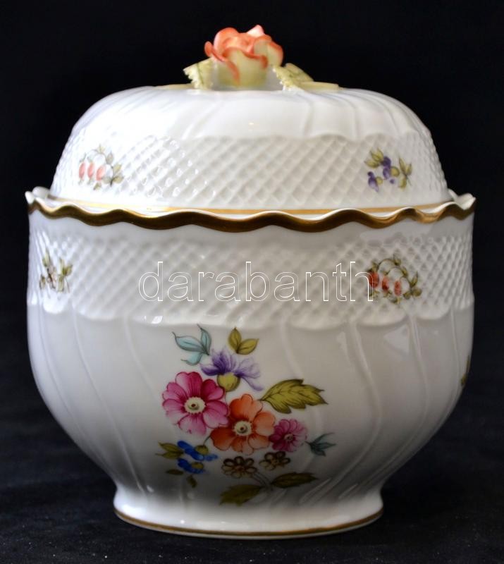 Leírás: Hollóházi porcelán virágmintás bonbonier, részben kézzel festett, jelzett, hibátlan, m: 11,5 cm