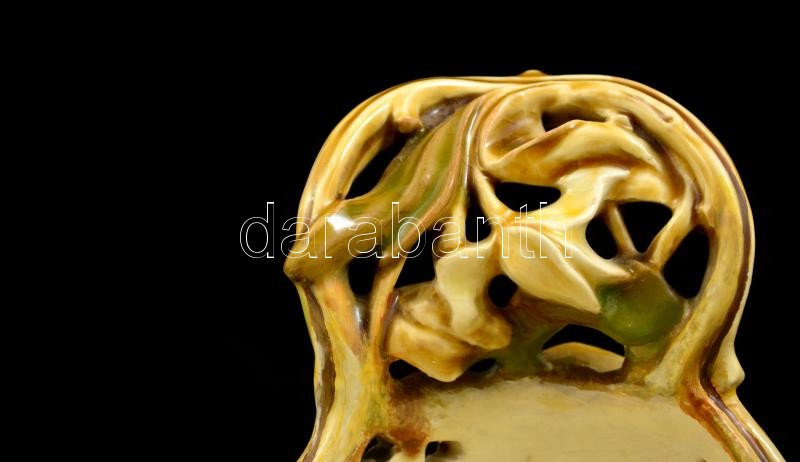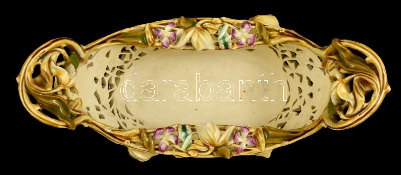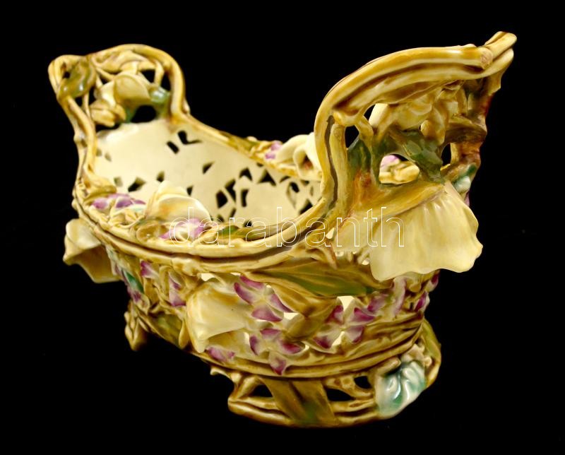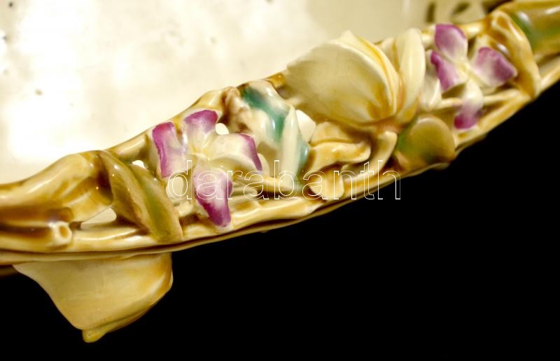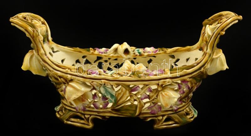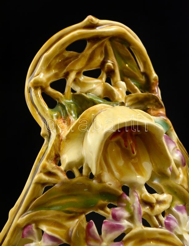 Zsolnay áttört jardiniere (Mályva-sorozatból), kézzel festett porcelánfajansz, plasztikus rátétekkel, jelzett (masszába nyomott Made in Austria Hungary illetve Zsolnay Pécs márkajelzés), formaszám: 3819, restaurált, m:15,5 cm, h:34,5 cm