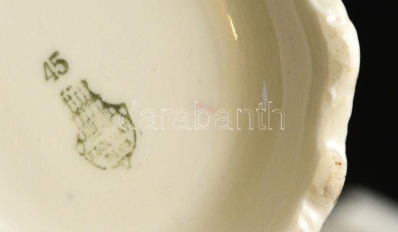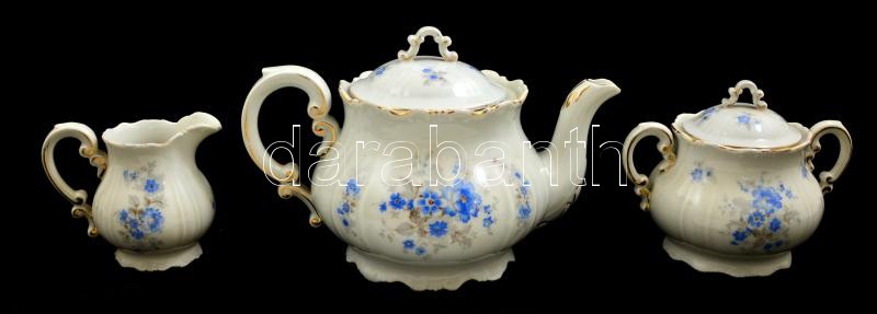 Leírás: Zsolnay teás készletből kiöntő, cukortartó, tejes. Jelzett, matricás, kopott.