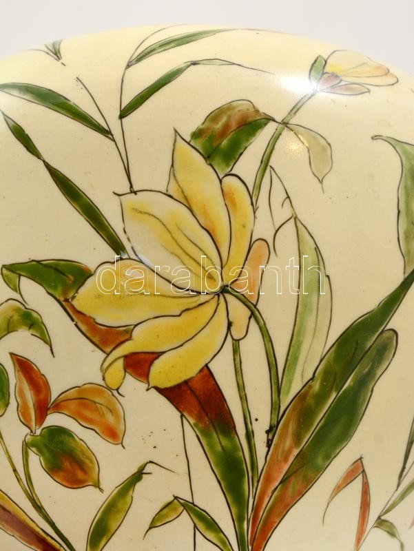 Leírás: cca 1890 Fischer virág mintás kaspó, kézzel festett porcelánfajansz, máz alatti hajszál repedésekkel, m: 16,5 cm, d: 27 cm