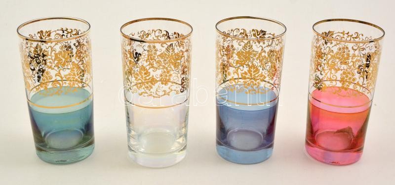 Leírás: Aranyozott színes üvegpoharak, 4 db, hibátlanok, m: 13,5 cm