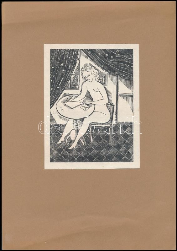 Leírás: Foujita Tsugouharu (1886-1968): Levelet író akt, fametszet, papír, jelzés nélkül, paszpartuban, 13,5×10 cm
