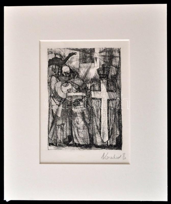 Leírás: Kondor Béla (1931-1972): Mise. Rézkarc, papír, utólagos jelzéssel, paszpartuban, 11,5×8 cm