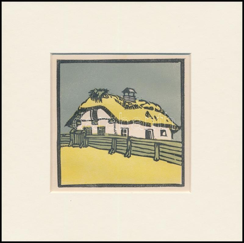 Leírás: Kós Károly (1883-1977): Erdély, színes linómetszet, papír, jelzés nélkül, paszpartuban, 10×10 cm