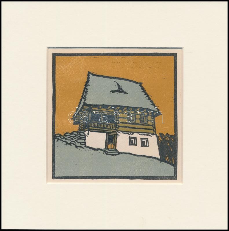 Leírás: Kós Károly (1883-1977): Erdély, színes linómetszet, papír, jelzés nélkül, paszpartuban, 10×10 cm