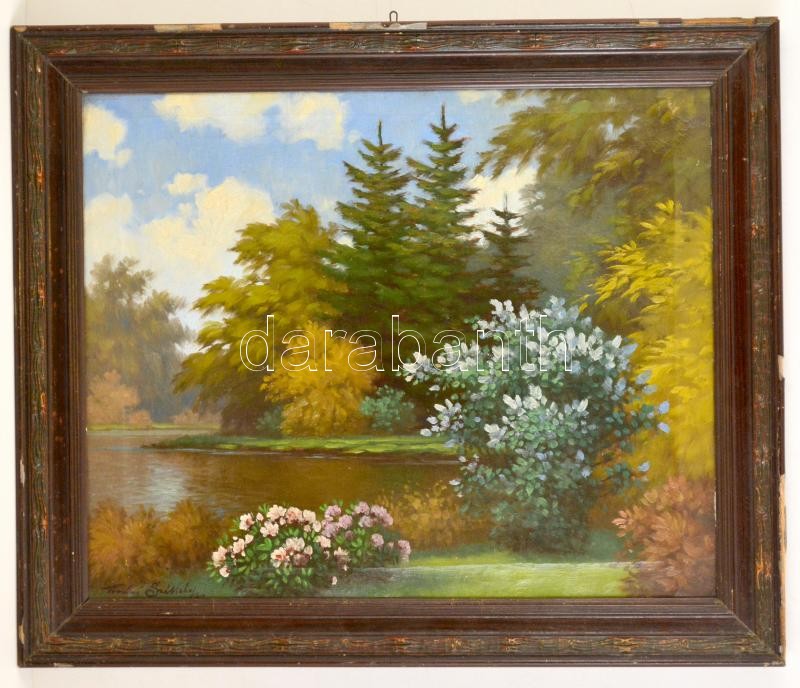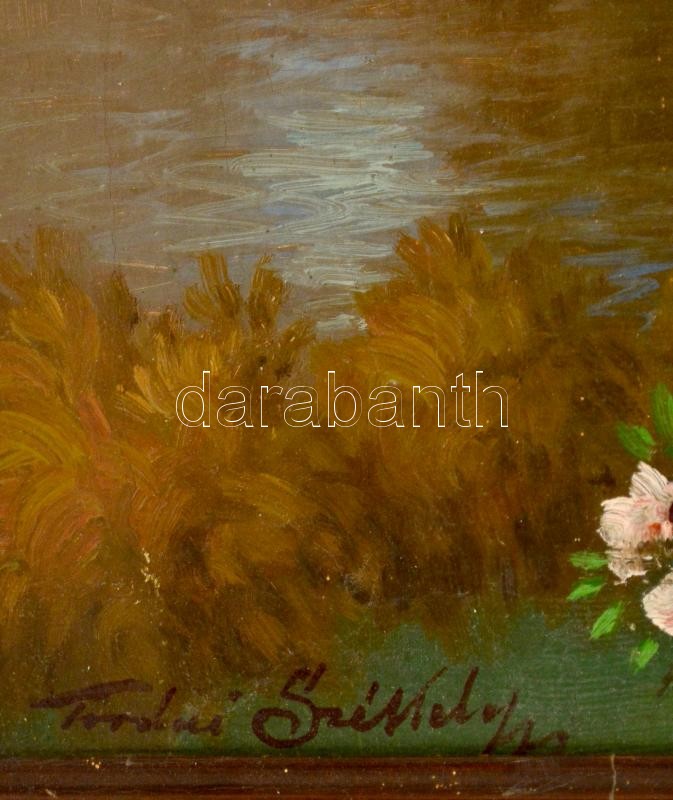 Leírás: Tordai Székely Mihály (1890-1940): Kerti idill, olaj, vászon, jelzett, sérült fa keretben, 47×58 cm