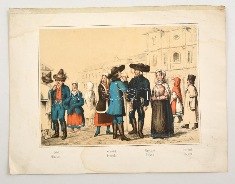 cca 1840 Magyarország népei: Magyarok, Tótok, Horvátok, Németek. litográfia Szerelmey Miklós (1803-1875) műhelyéből. / cca 1840 Nationalities of Hungary: Slovakians, Croatians, Germans, Hungarians. Lithography. 25x20 cm