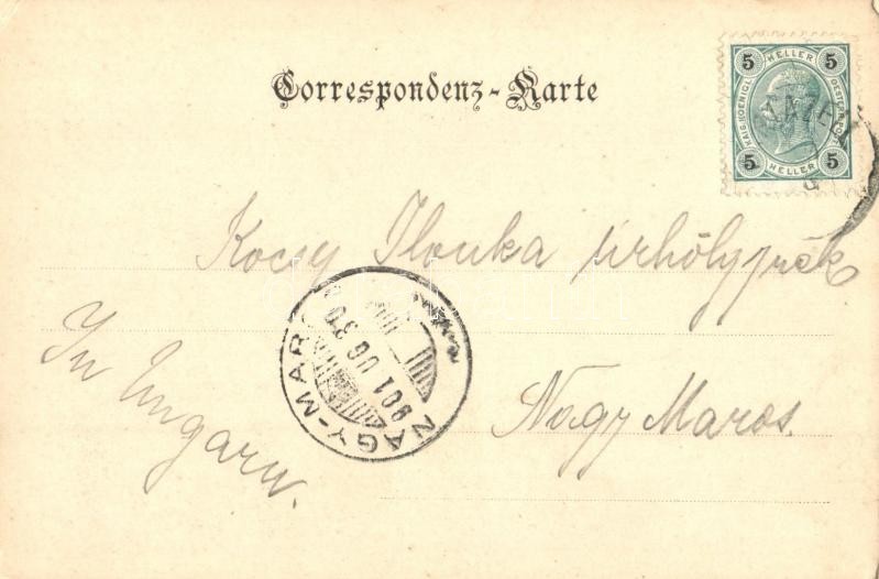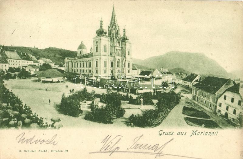 Leírás: 1901 Mariazell, Pilgrimage church, shops, guest house, inn. O. Schleich Nachf. (EK)