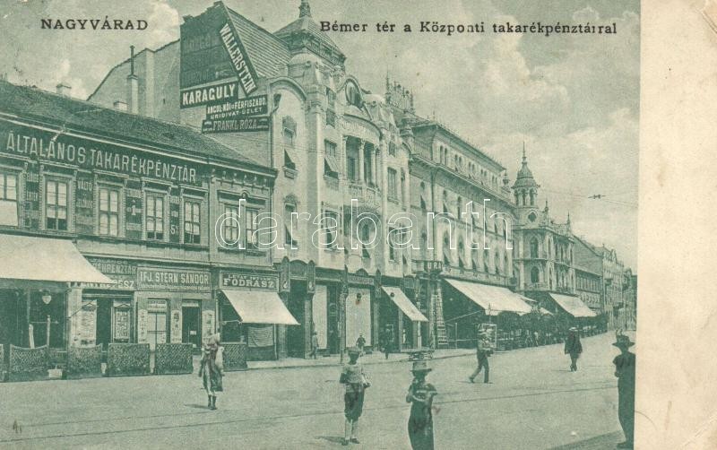 1914 Nagyvárad, Oradea; Bémer tér, Központi takarékpénztár, Wallerstein, Karaguly, Frankl Róza, Lévay István, Ifj. Stern Sándor üzlete, Adria biztosító intézet, kávéház, létra. Kiadja Sonnenfeld / square, savings bank, shops, insurance company, café, ladder (EK)