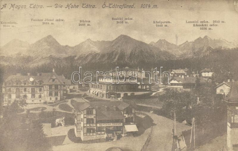 Leírás: Ótátrafüred, Altschmecks, Stary Smokovec (Tátra); Kávéház, Kertész Tódor üzlete, hegycsúcsok / cafe, shop, mountain peaks