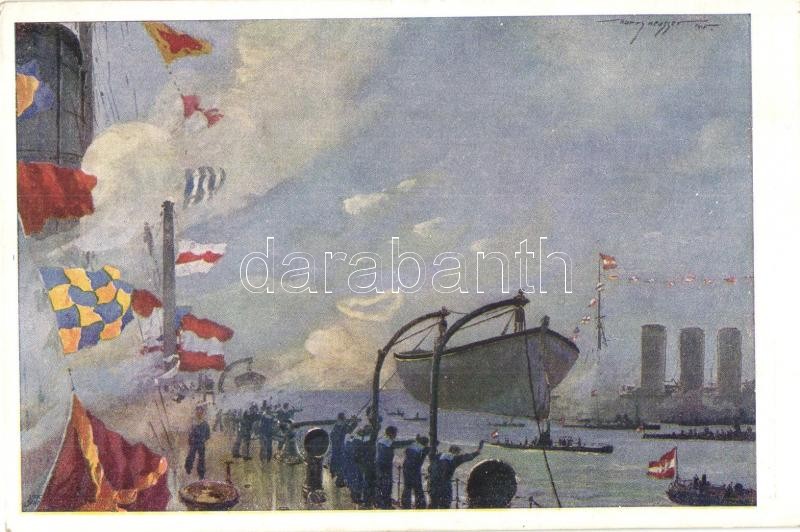 Heimkehr des U V (SM U-5) nach der Torpedierung des französischen Panzerkreuzers "Leon Gambetta" in den heimischen Hafen. K.u.K. Kriegsmarine. Offizielle Karte für Rotes Kreuz. Kriegsfürsorgeamt Kriegshilfsbüro / WWI Austro-Hungarian Navy SM U 5 submarine returns home after sinking the French armored cruiser "Leon Gambetta". s: Harry Heusser (EK)