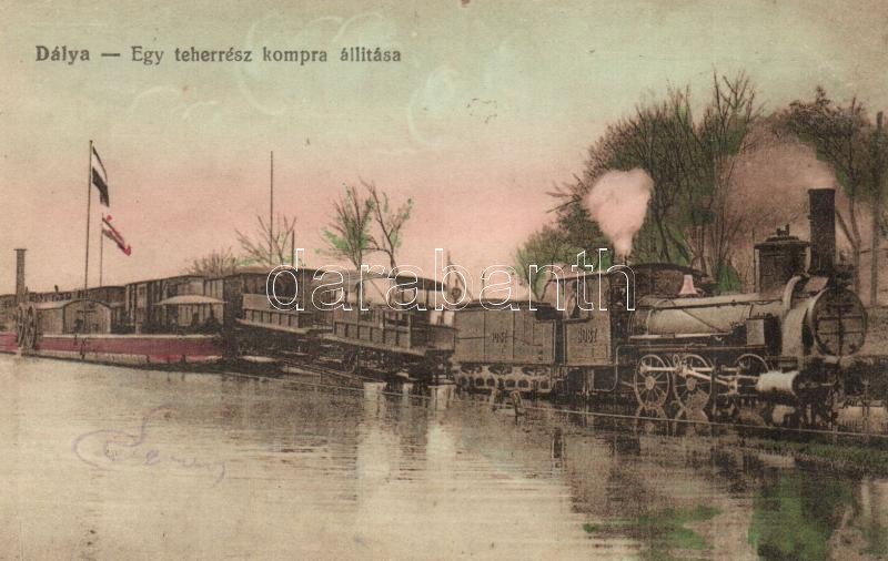 Dálya, Dalja, Dalj; gőzkomp Gombos és Erdőd között, gőzmozdony kompra állítása / steam ferry with freight train between Bogojevo and Erdut on the Danube, locomotive