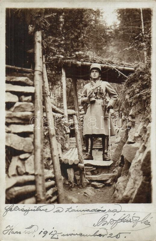 1917 Felkészülve a támadásra. Katona teljes menetfelszerelésben gázálarccal és távcsővel. Gróf László a 16. honvéd hegyi dandár XXIX/1/3 mszd. hadapródja / WWI K.u.K. military, soldier in full gear with binoculars and gas mask. photo