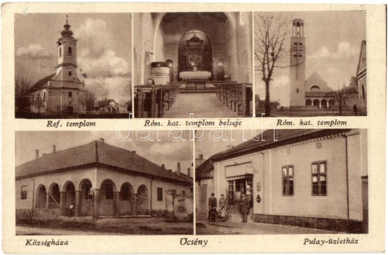 Leírás: Őcsény, Református és római katolikus templom, belső, Pulay üzletház, községháza. Pulay György kiadása (Rb)