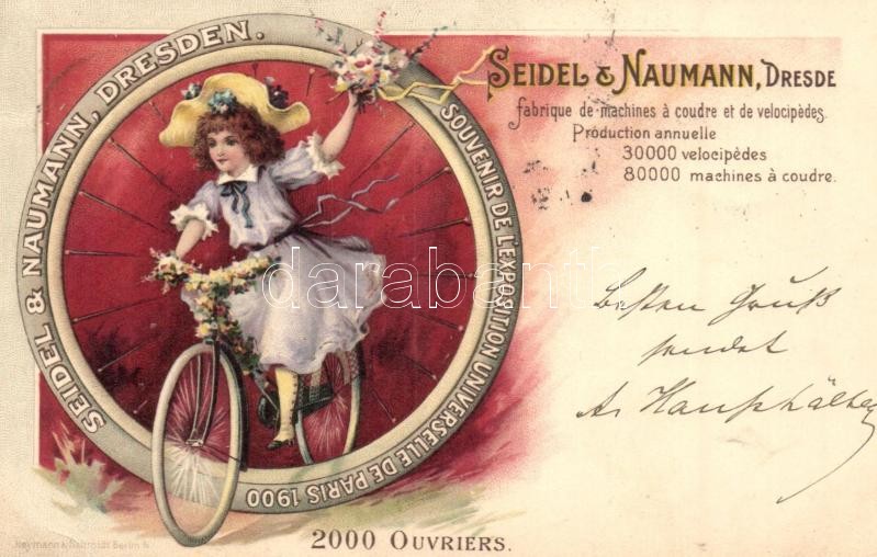1900 Seidel & Naumann Fabrique de machines a coudre et de velocipedes. Dresden. Souvenir de l'Exposition Universelle de Paris 1900. / German sewing machines and bicycles manufacture advertisement. Neymann & Schmidt floral, litho (EK)