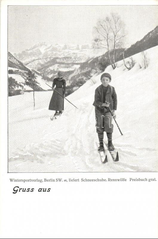 Leírás: Gruss aus... Schneeheil! Wintersportverlag Berlin SW. 46. liefert: Schneeschuhe, Rennwölfe etc. Illustr. Brochure gratis / Winter sport, skiing art postcard