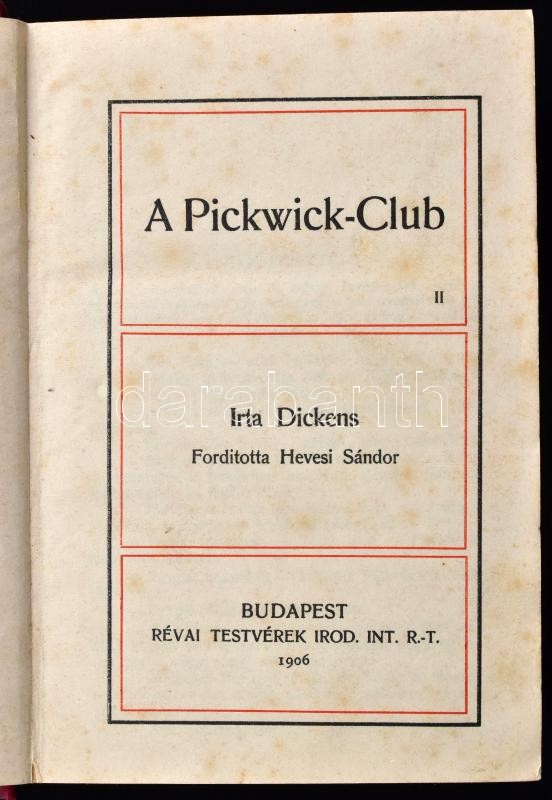 Dickens: A Pickwick-Club II. Fordította Hevesi Sándor. Klasszikus regénytár. Bp., 1906, Révai Testvérek Irodalmi Intézet Rt. Átkötött félvászon kötésben.