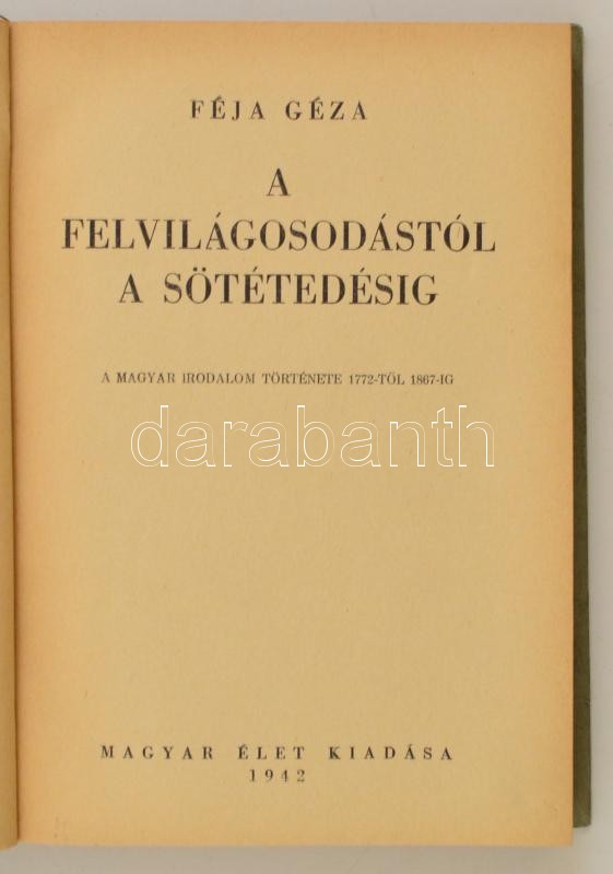 Féja Géza: A felvilágosodástól a sötétedésig. Bp., 1942, Magyar Élet. ... https://www.darabanth.com/hu/337-Gyorsarveres/337.0/Konyvek/Konyvek-Egyeb-ritkasagok~1000018/Feja-Geza-A-felvilagosodastol-a-sotetedesig-Bp-1942-Magyar-Elet-Kiadoi-felvaszon-k~II1894192