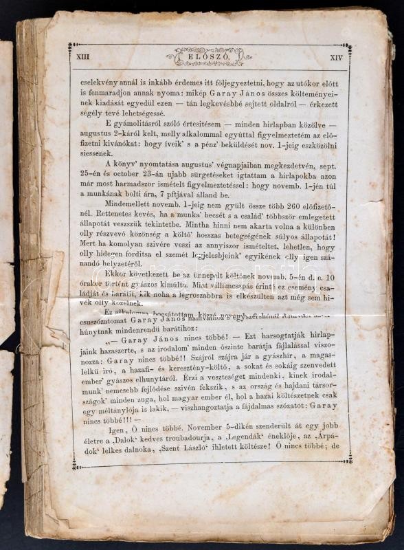 Garay János összes költeményei. Baráti megbízásból kiadta, az előszót és az életrajzot írta Ney Ferencz, Pest, 1854, [Müller Emil-ny.], V-XXXVIII+ 1062 hasábszámozás. Első kiadás. A borítója, a címkép, és a címlapja, a kötése szétvált, rossz állapotban.