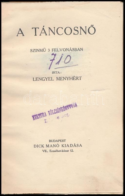 Lengyel Menyhért: A táncosnő. Színmű 3 felvonásban. Bp.,1915,Dick Manó... https://www.darabanth.com/hu/337-Gyorsarveres/337.0/Konyvek/Konyvek-Egyeb-ritkasagok~1000018/Lengyel-Menyhert-A-tancosno-Szinmu-3-felvonasban-Bp-1915-Dick-Mano-125plus2-p-Elso-kiada~II1892158
