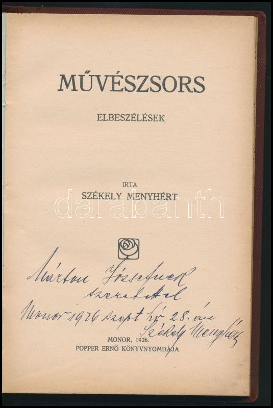 Leírás: Székely Menyhért: Művészsors. Elbeszélések. Monor, 1926, Popper Ernő, 87 p. Kiadói aranyozott egészvászon-kötés. A szerző által dedikált.