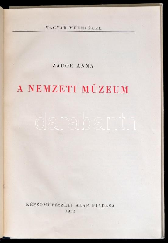 Zádor Anna: A Nemzeti Múzeum. Magyar Műemlékek. Bp.,1953, Képzőművészeti Alap. Fekete-fehér fotókkal. Kiadói félvászon-kötés, kissé kopott borítóval. Megjelent 2000 példányban.