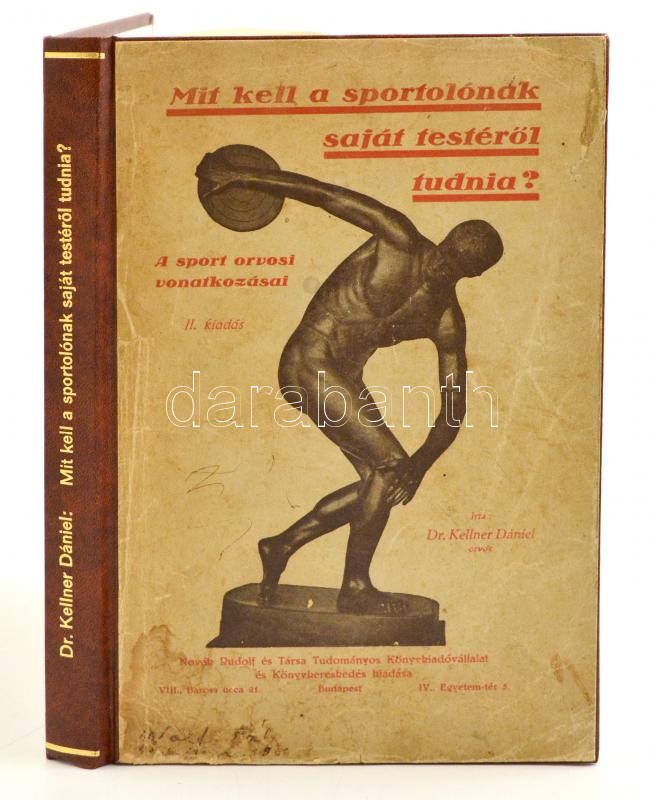 Dr. Kellner Dániel: Mit kell a sportolónak saját testéről tudnia? A sport orvosi vonatkozásai. Bp.,1928,Novák Rudolf és Társa, 204+4 p.+ 15 t. Fekete-fehér táblákkal, és szövegközti fekete-fehér fotókkal illusztrált. Második kiadás. Kiadói műbőr-kötés, az elülső papírborítót az átkötéskor felhasználták, a címlap kissé sérült, hiányos, névbejegyzéssel, ceruzás aláhúzással bejelöléssel.