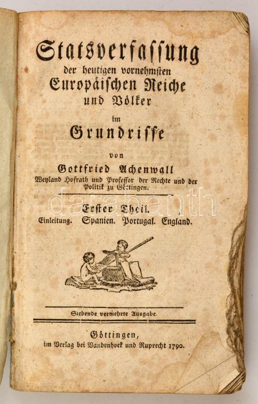 Achenwall, Gottfried: Staatsverfassung der heutigen vornehmsten europaischen Reiche im Grundrisse, Erster Theil (Einleitung, Spanien, Portugal, England), Göttingen,1790. Vandenhoek und Ruprecht, 368p. Korabeli papírkötésben, első néhány lap szélén sérüléssel / In paper binding some pages edge damaged.