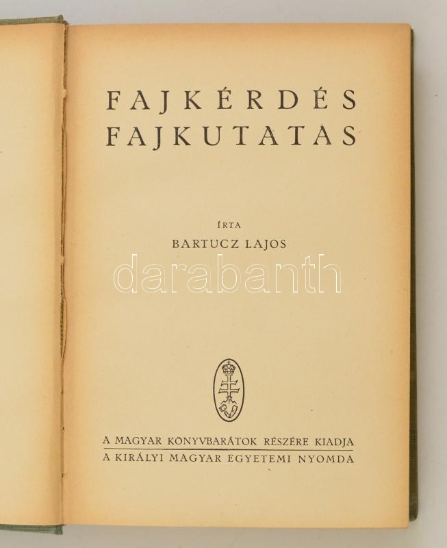 Bartucz Lajos: Fajkérdés, fajkutatás. 58 fekete-fehér ábrával és 43 fotóval illusztrálva. Bp., é.n., Királyi Magyar Egyetemi Nyomda. Kiadói egészvászon kötésben, kissé fakó borítóval és gerinccel.