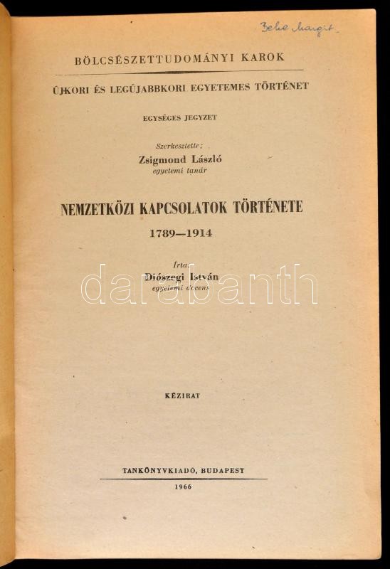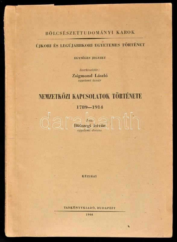 Leírás: Diószegi István: Nemzetközi kapcsolatok története. 1789-1914. Kézirat. ELTE Bölcsésztudományi Kar. Bp., 1966, Tankönyvkiadó. Kiadói papírkötés, ceruzás aláhúzásokkal. Megjelent 1075 példányban. Beke Margit (1939-) történész, levéltáros névbejegyzésével.
