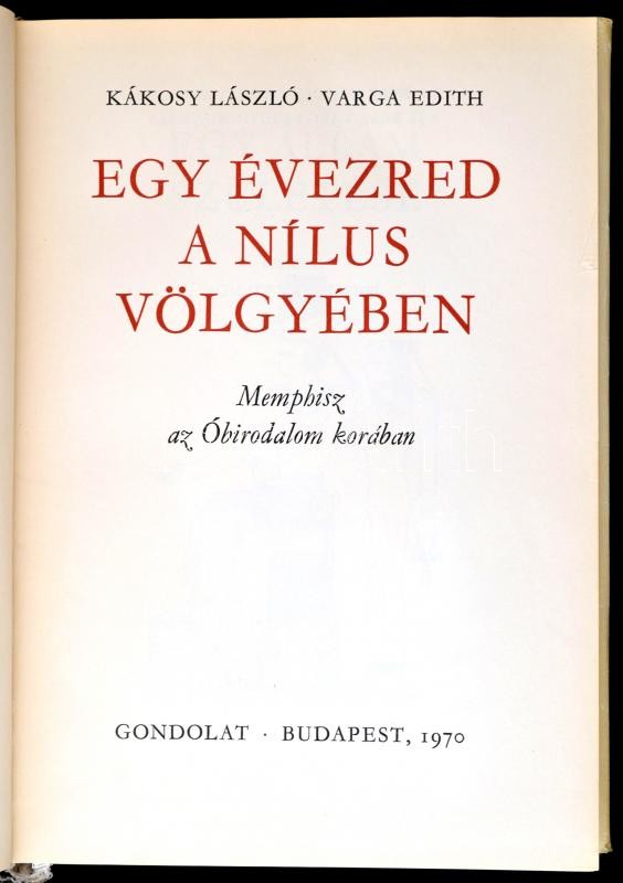 Leírás: Kákosy László-Varga Edith: Egy évezred a Nílus völgyében. Memphisz az Óbirodalom korában. Bp.,1970, Gondolat. Fekete-fehér fotókkal illusztrált. Kiadói egészvászon-kötés, kiadói szakadt papír védőborítóban.