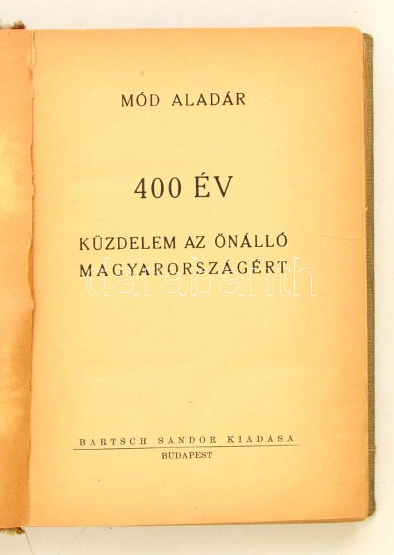 Mód Aladár: 400 év küzdelem az önálló Magyarországért. Bp., 1943, Bartsch Sándor. Kiadói egészvászon kötésben, sérült gerinccel, kissé laza fűzéssel, kissé kopott borítóval.
