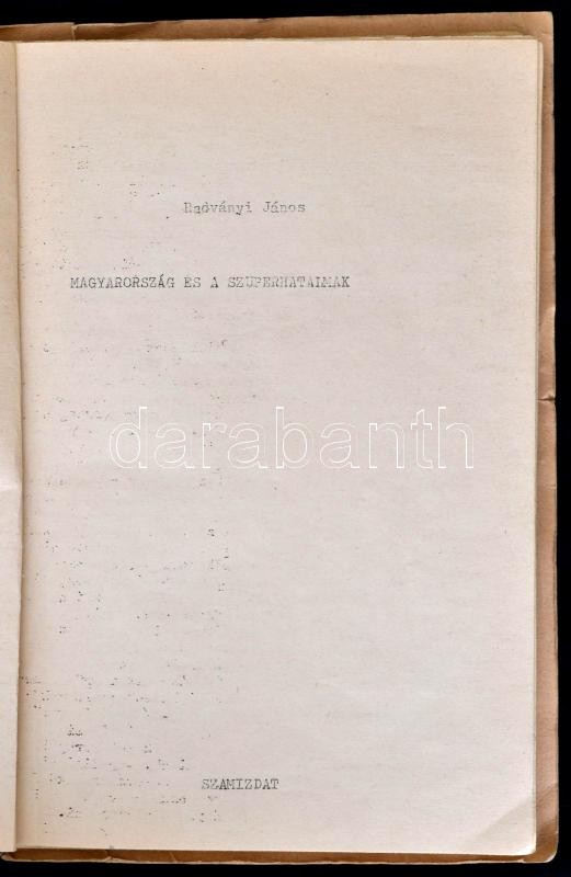 Radványi János: Magyarország és a szuperhatalmak. Írta: Radványi János volt washingtoni nagykövet. hn., é.n., nyn., 129 p. Kiadói papírkötés, szakadt borítóval. Szamizdat. Gépirat után sokszorosítva.