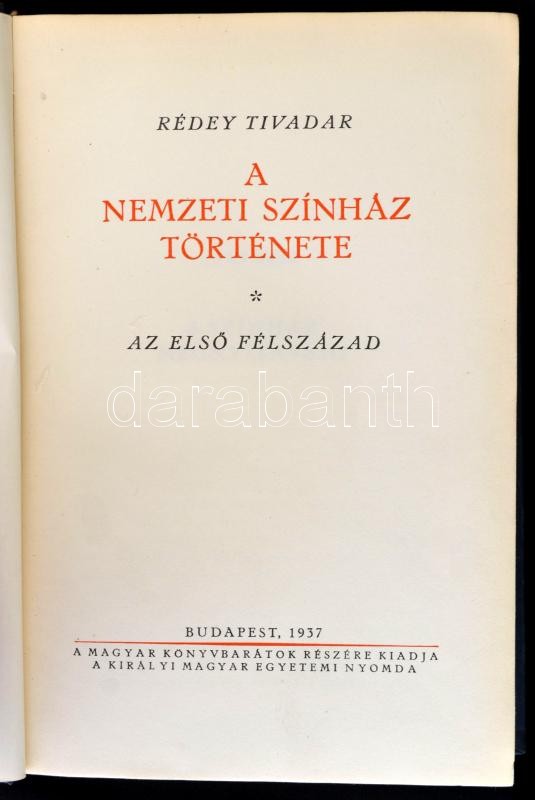 Rédey Tivadar: A Nemzeti Színház története. Az első félszázad. Budapest, 1937, Királyi Magyar Egyetemi Nyomda, 405 p. Kiadói aranyozott egészvászon kötés.