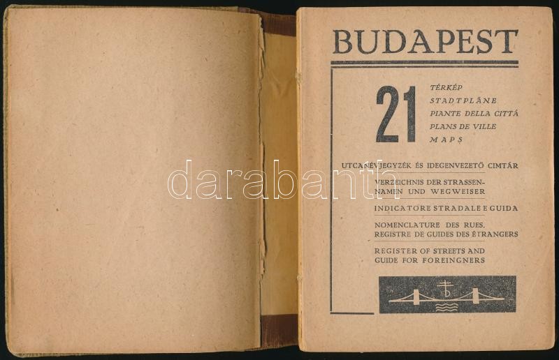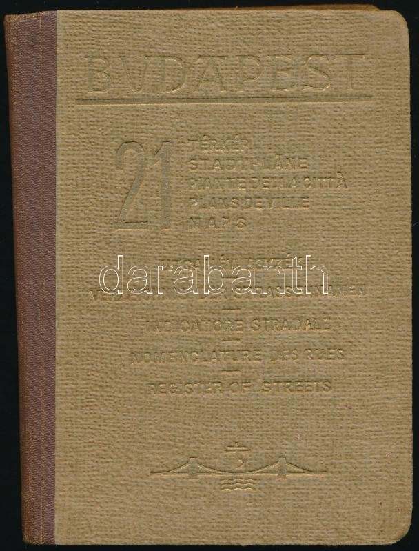 Budapest 21 térkép. Utcanévjegyzék és idegenvezető címtár. A kerületi térképeket rajzolta és az utcanévjegyzéket összeállította: Gáll Pongrác. Bp.,1942, Hellas Irodalmi és Nyomdai Rt., 200 p.+ 20 t. Kiadói kissé kopottas félvászon-kötésben, Elvált fűzéssel, egy térkép hiánnyal.