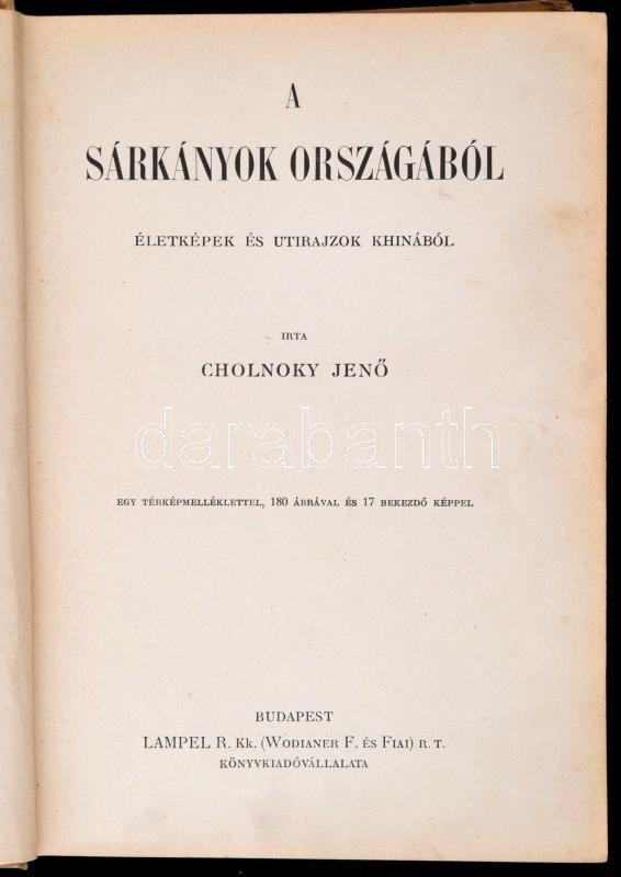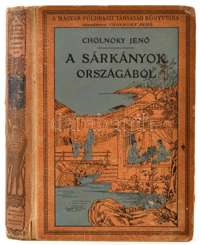 Cholnoky Jenő: A sárkányok országából. Magyar Földrajzi Társaság Könyvtára. Bp., é.n., Lampel R. (Wodianer F. és Fiai), XV+ 407 p. Számos szövegközti, és egészoldalas rajzzal, ábrával fotóval illusztrálva. Kiadói illusztrált, aranyozott félvászon-kötés, kopott borítóval, sérült gerinccel, hiányzó kihajtható térképpel.