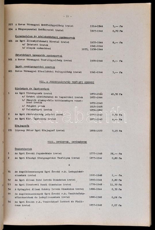 Egri Állami Levéltár fondjainak jegyzéke. Magyar Állami Levéltárak fondjegyzéke. III. kötet. Területi Levéltárak Fondjegyzékei 4. rész. Bp., 1962, Művelődésügyi Minisztérium Levéltári Osztálya - Levéltárak Országos Központja, 44 p. Kiadói papírkötés, jó állapotban. Megjelent 600 példányban.