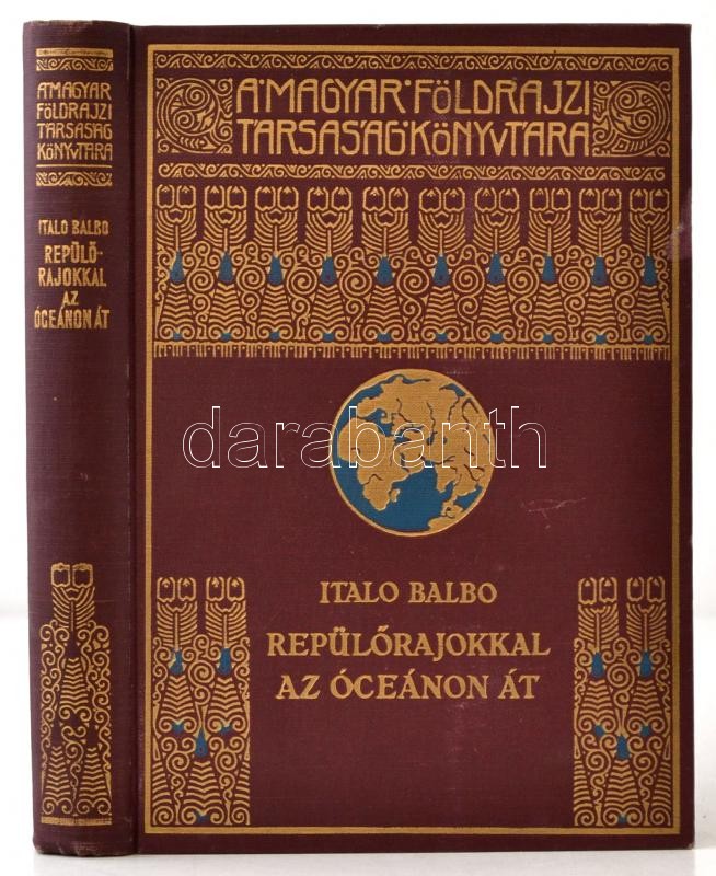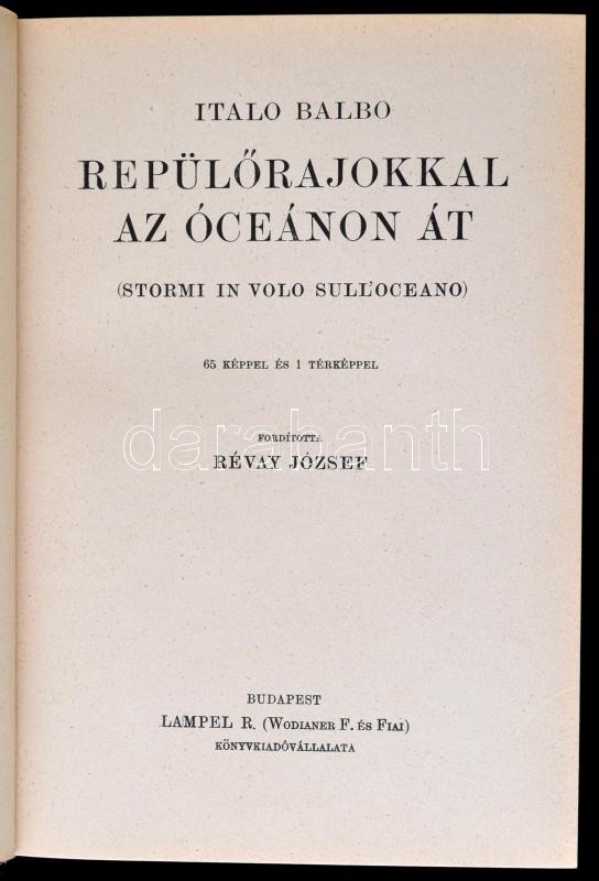 Italo Balbo: Repülőrajokkal az óceánon át. Fordította Révay József. Magyar Földrajzi Társaság Könyvtára. Bp.,é.n,Lampel R. (Wodianer F. és Fiai). Egészoldalas fekete-fehér fotókkal illusztrálva. Kiadói aranyozott egészvászon sorozatkötésben, kissé kopott borítóval, egyébként jó állapotban.