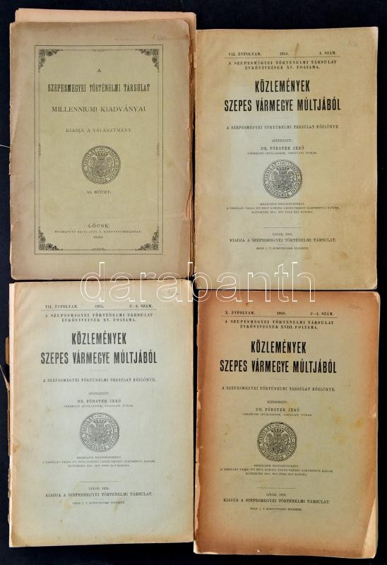 Közelmények Szepes Vármegye múltjából. Szerk.: Dr. Förster Jenő. VII. évf. 1., 2-4. sz., X. évf. 2-4. sz. Lőcse, 1915-1918, Szepesmegyei Történelmi Társulat. Kiadói papírkötés, szakadozott borítóval, sérült gerinccel, kötéssel. + Sváby Frigyes: A Szepesség lakosságának sociologiai viszonyai a XVIII. és XIX. században. A Szepesmegyei Történelmi Társulat milleniumi kiadványa. VI. kötet. Lőcse, 1901, Reiss József, 80 p. Kiadói papírkötés, rossz, hiányos állapotban.
