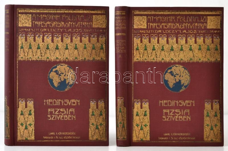 Sven Hedin: Ázsia szívében I-II. kötet. Tízezer kilométernyi úttalan utazás. Fordította: Dr. Thirring Gusztáv. képpel és térképpel. Magyar Földrajzi Társaság Könyvtára. Bp., é. n., Lampel R. (Wodianer F. és Fiai) Rt., 10+214+2;6+270+2 p. Gazdag fekete-fehér fotókkal és egy térképpel illusztrálva. Kiadói dúsan aranyozott egészvászon sorozat-kötésben, a borítón kopásnyomokkal, egyébként jó állapotban.