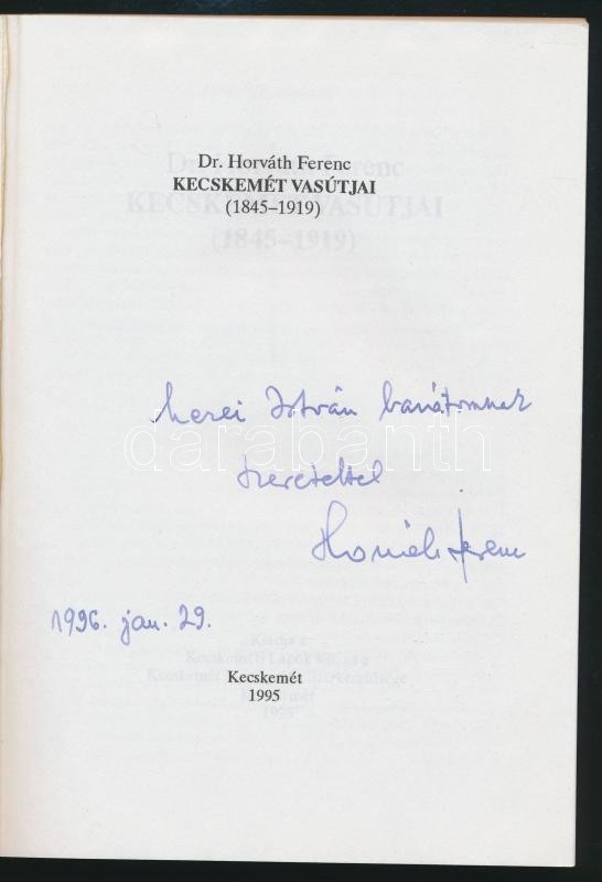 Dr. Horváth Ferenc: Kecskemét vasútjai. (1845-1919.) Kecskemét, 1995, Kecskeméti Lapok Kft-Kecskeméti Monográfia Szerkesztősége. Kiadói papírkötés. Megjelent 1000 példányban. A szerző, Dr. Horváth Ferenc által Mezei István (?-2015) gépészmérnök, MÁV főtanácsos, vasúti szakíró, vasúttörténész részére dedikált példány.