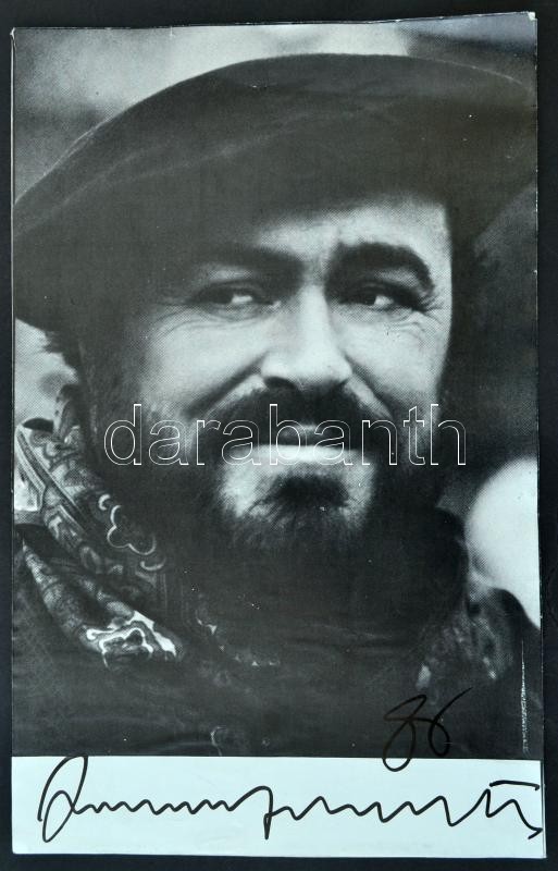 1986 Magyar Állami Operaház és Erkel Színház 1986. februári plakátjai, 4 db, rajtuk Luciano Pavarotti, Rico Saccani, Madelyn Renee szereplésével, az Erkel Színház Puccini: Bohémélet, 1986. február 24., plakátján Luciano Pavarottival, egy nagyméretű Luciano Pavarotti-t ábrázoló fotó kivágáson Luciano Pavarotti aláírásával, további két újságcikkel, és a belépővel, különböző méretben.